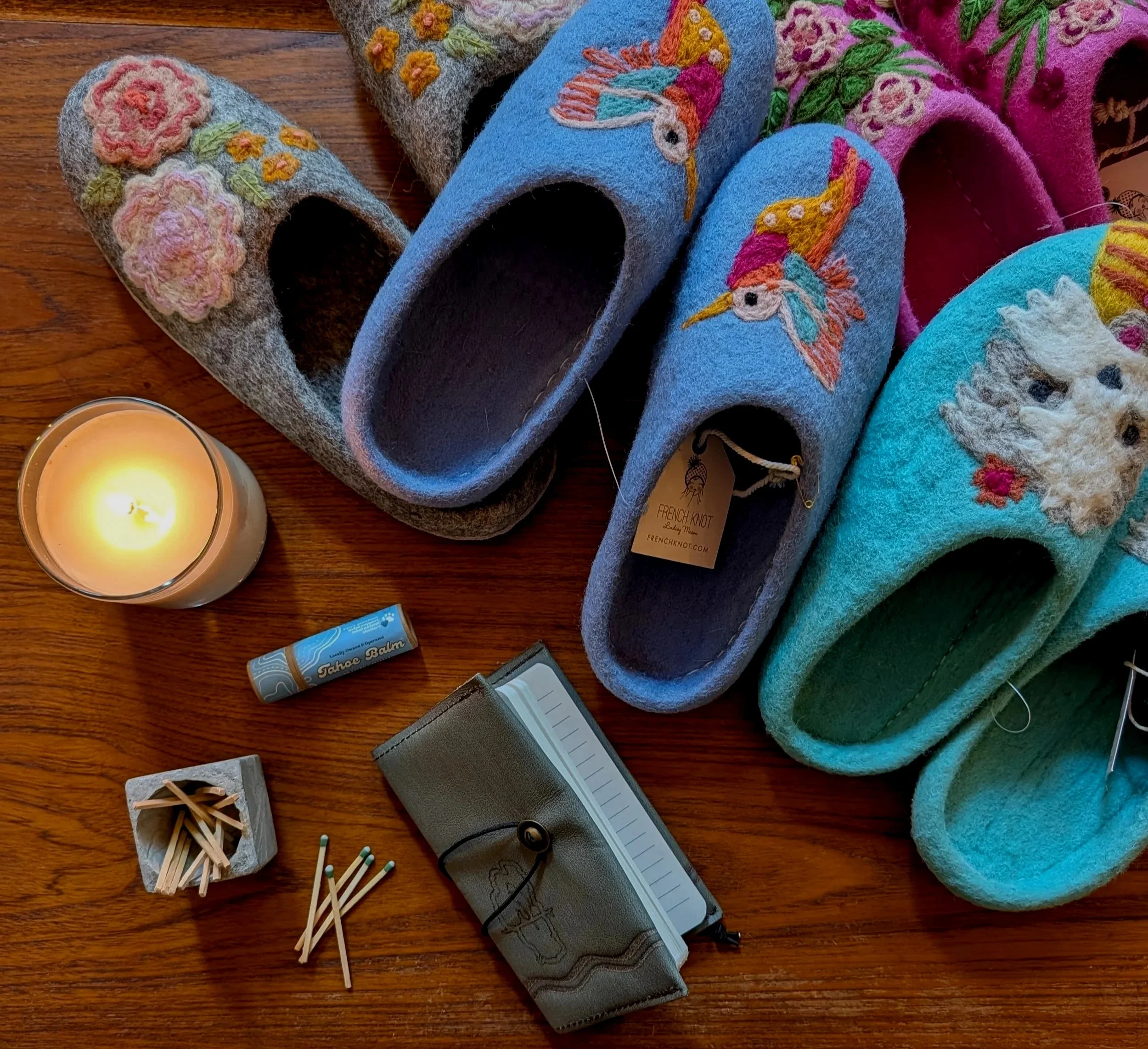 Settle in and relax with a hand-poured candle from 1502 Candles, leather journal from Sustain Tahoe, Tahoe Balm (locally made, small-batch & eco-friendly lip balm), and a pair of adorable handmade wool slippers from French Knot by Lindsay Mason. Made from 100% wool and leather soles, these unique slippers are sure to add a little whimsy to your feet. Please note requested size (6-10) and color (yorkie, hummingbird, pink flower, or gray flower).